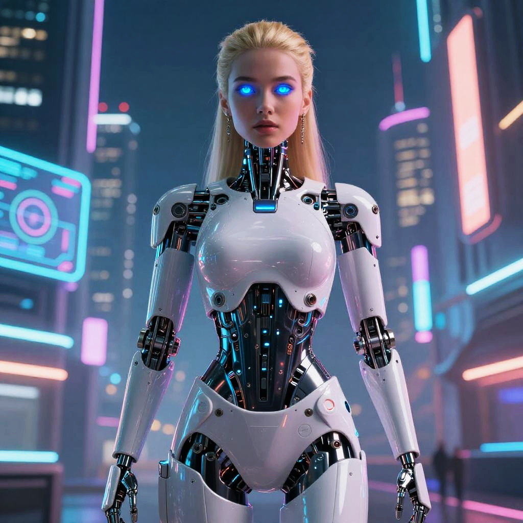 AI bikini girl standing confidently on a desert planet with twin suns, her robotic limbs gleaming under the harsh light, wearing a sleek, minimalist bikini with neon highlights, sci-fi desert landscape with alien flora, highly detailed and vivid futuristic illustration.