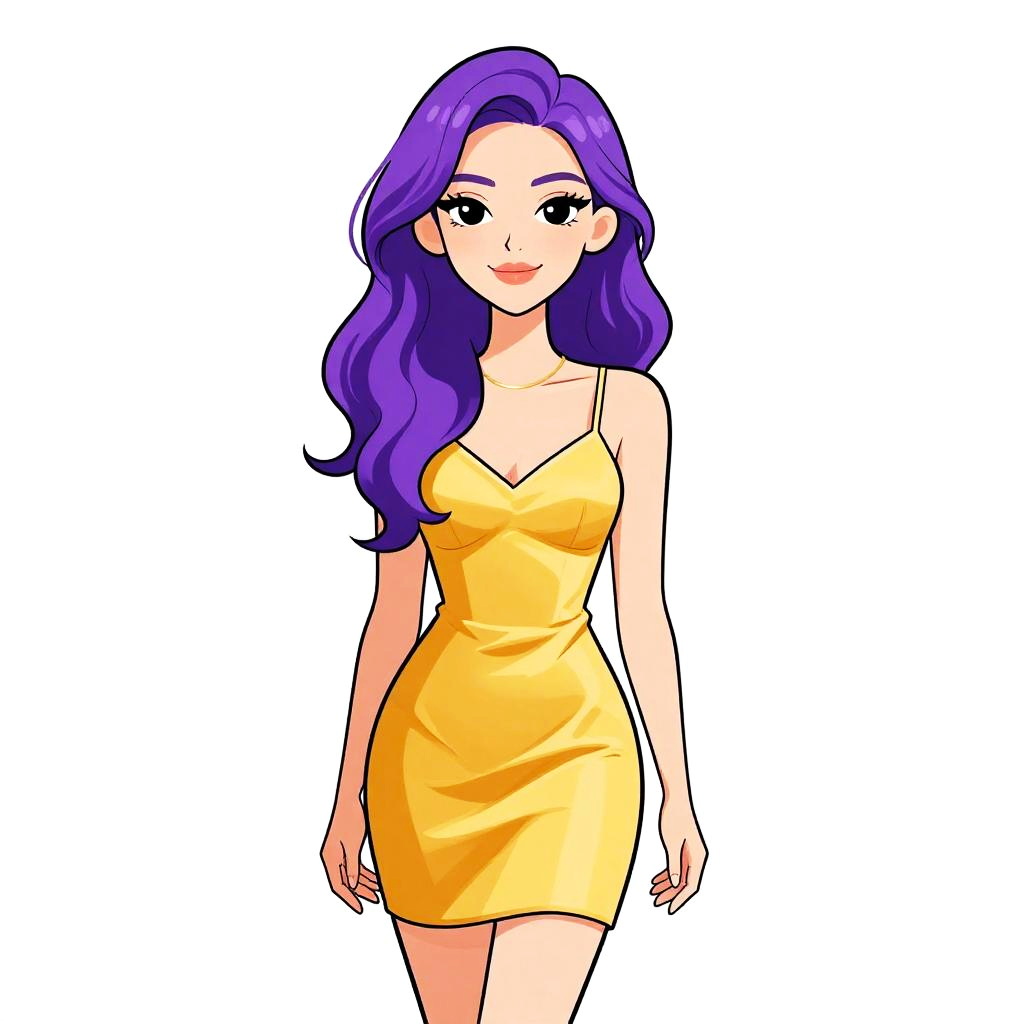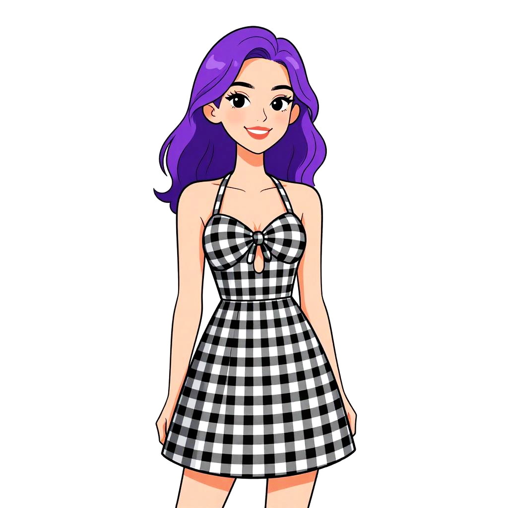 Illustration of a woman with long, wavy purple hair wearing a light blue strapless romper decorated with a small white floral pattern. The romper features a fitted bodice and flared shorts. The woman has a fair complexion, purple eyes, and coral lips, standing against a white background.