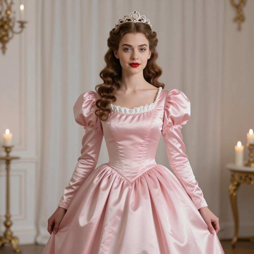 Abdl princess dress, digital art, princess in pink satin dress, Victorian style, long sleeves, puffed shoulders, white collar, tight corset, full skirt, brown curly hair, tiara, fair skin, red lips, neutral expression, elegant, indoor background, blurred candles and white curtains, realistic lighting, high detail, portrait style, realistic ure, T2I model, photograph-like quality