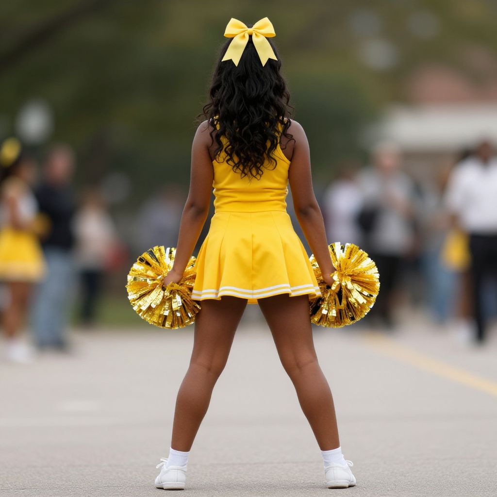 Photograph of a black female cheerleader in a yellow dress, holding gold pom-poms, with a yellow bow in her curly hair, standing on