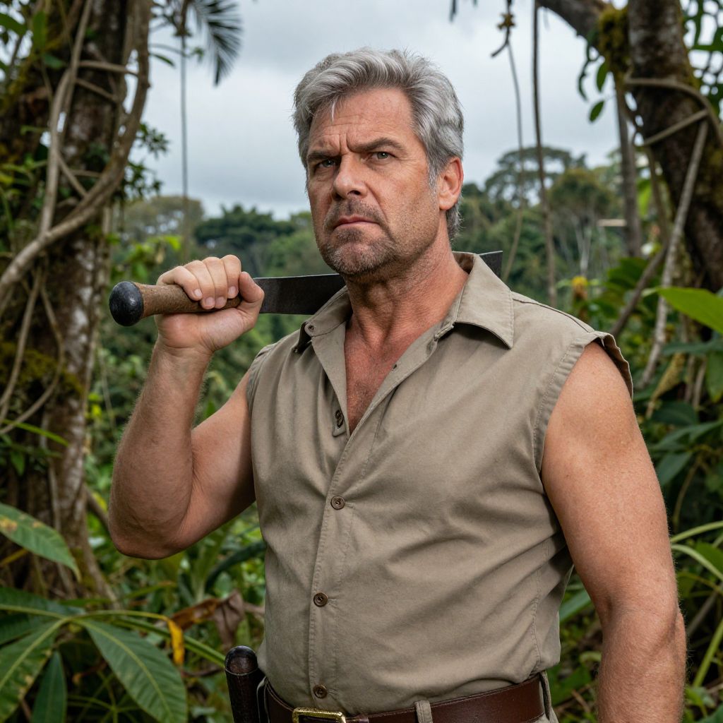 A male in a 1980s jungle explorer costume with a short silver hair wig, standing in a dense tropical forest under a cloudy sky; his face is rugged with a strong chin, broad forehead, and a thoughtful expression as he holds a machete, detailed textures of moss, vines, and jungle foliage in background, natural lighting and high-resolution realistic photography.