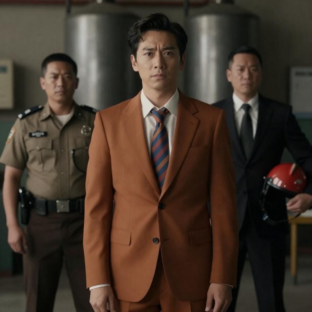 Asian man with short black hair, wearing a gray suit and brown tie, sitting in a dark room, holding a cigarette in his right hand, relaxed posture, dim lighting, blue and red light in background.
