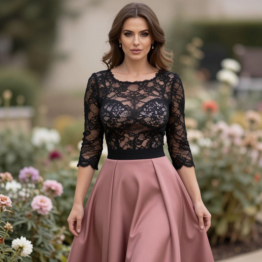 Elegant Woman in Black Lace Top and Dusky Rose Satin Skirt