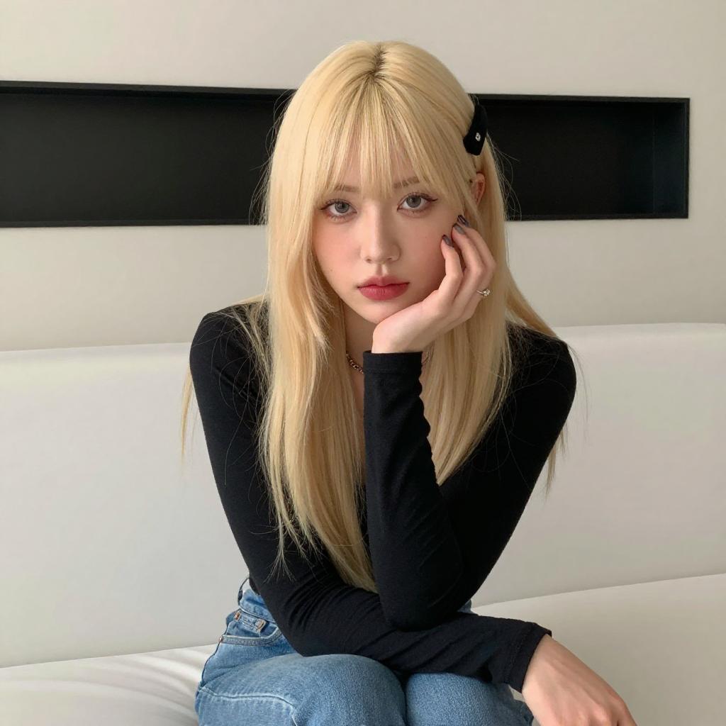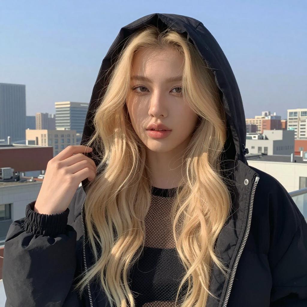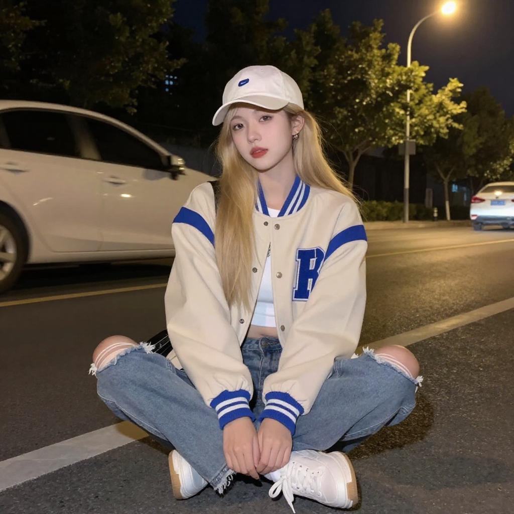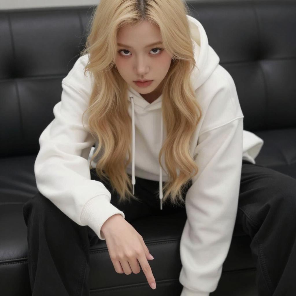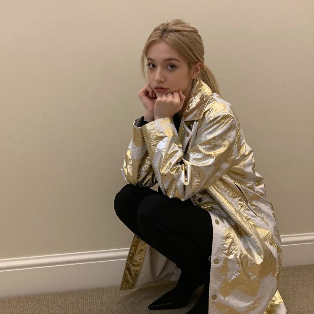 Photograph of a young woman with long blonde hair, wearing a beige fuzzy coat, beige pants, white sneakers, black gloves, and a white headband. She is squatting on a brown tiled floor, with a glittery car and ropes in the background. Her expression is neutral, and she is illuminated by bright lights.