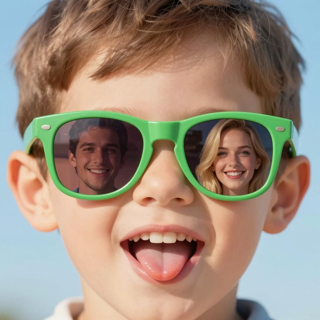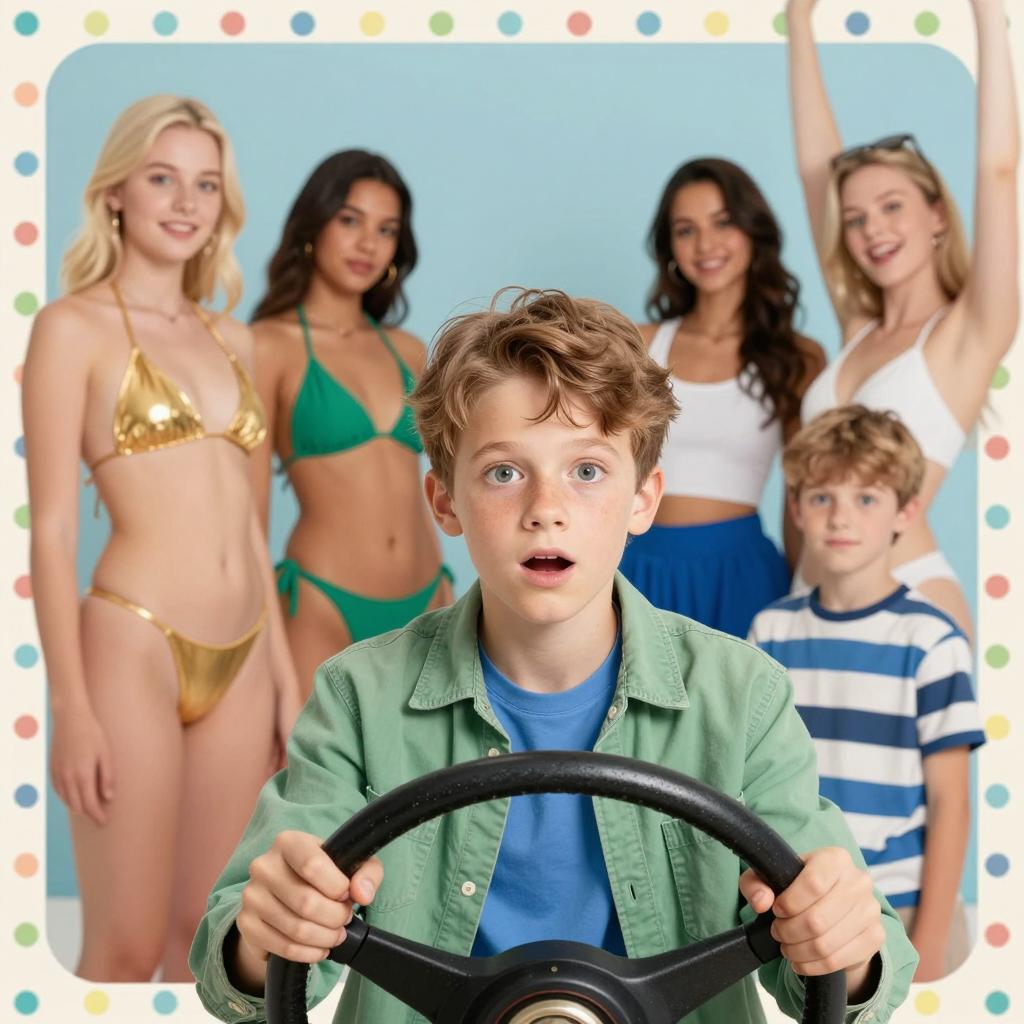 A group of six young people. Foreground: brown-haired boy with green jacket, blue shirt, surprised expression, holding a steering wheel. Background: blonde woman in gold bikini, dark-haired woman in green bikini, dark-haired woman in white top and blue skirt, light-haired boy in striped shirt, light-haired woman with arm raised. Blue sky and polka-dot border.