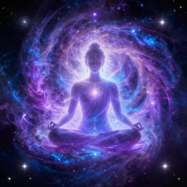 Silhouetted meditating figure in a cosmic swirl of purple, blue, and white energy against a starry space background. Digital artwork.