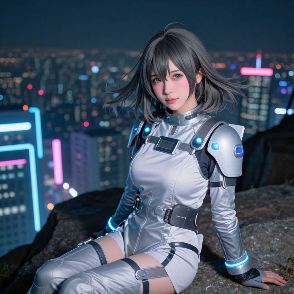 A young woman with a natural grey hairstyle, flowing softly over her shoulders, wears a futuristic space explorer costume featuring silver fabric and glowing blue accents, sitting on a rocky cliff overlooking a neon-lit city at night, her face has soft pink cheeks and bright green eyes, cinematic realism, detailed textures. The woman has big breasts and cute face