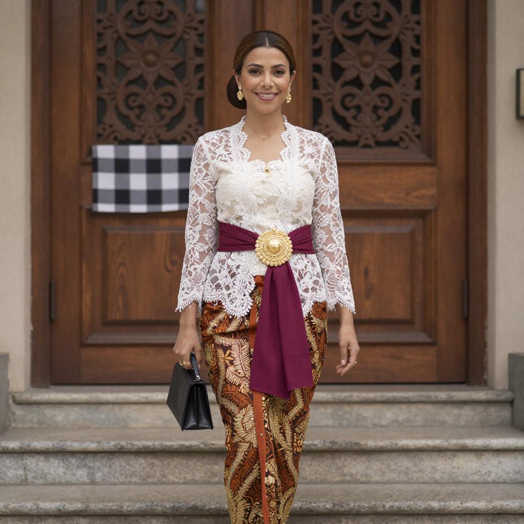 Photograph of a smiling woman with light brown skin and brown hair in a bun, wearing a white lace long-sleeve top, gold and orange patterned pants, and a maroon sash with a gold ornament. She holds a black purse and stands on stone steps in front of a wooden door with intricate carvings and a black-and-white checkered cloth.