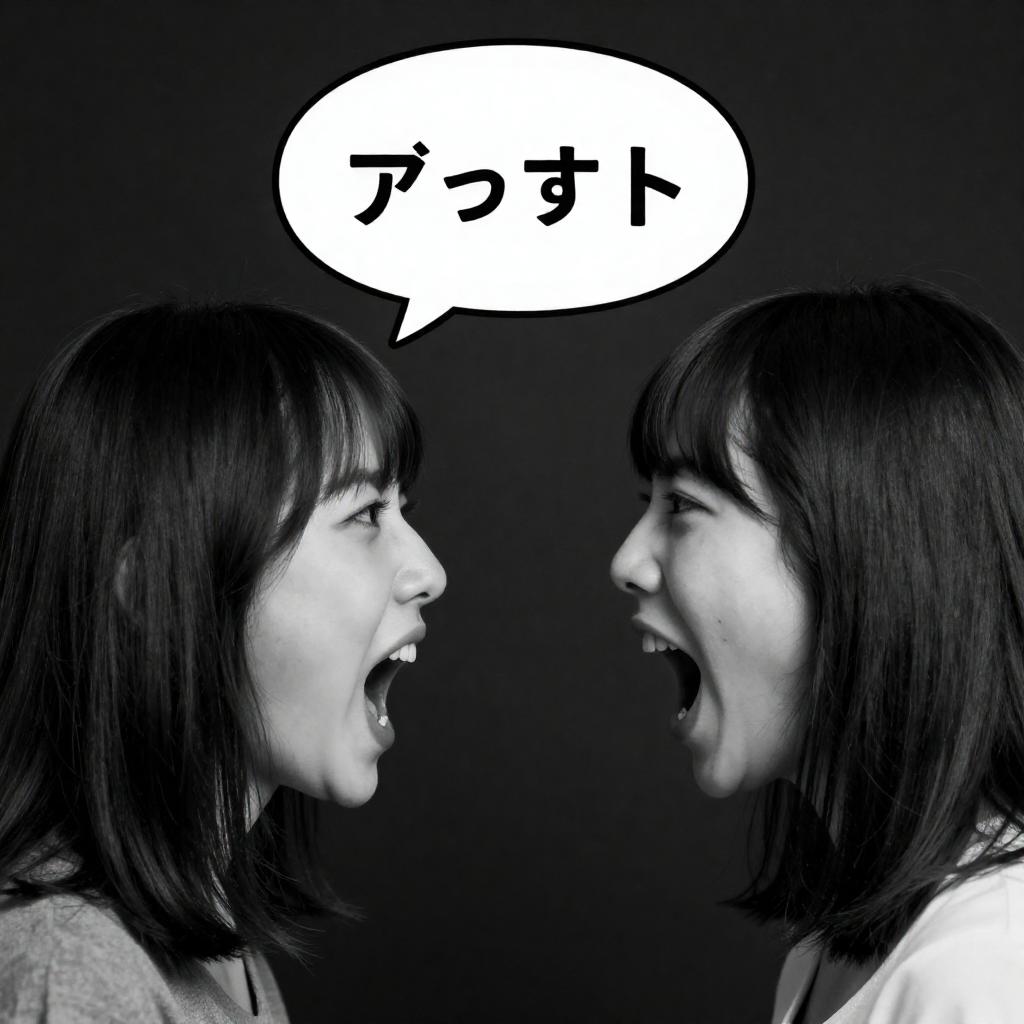 Black-and-white photograph of two women with straight, shoulder-length hair facing each other, mouths open in mid-shout. Japanese in speech bubble between them. Dark background. Women's faces intense, hair bangs framing foreheads. Speech bubble centered.