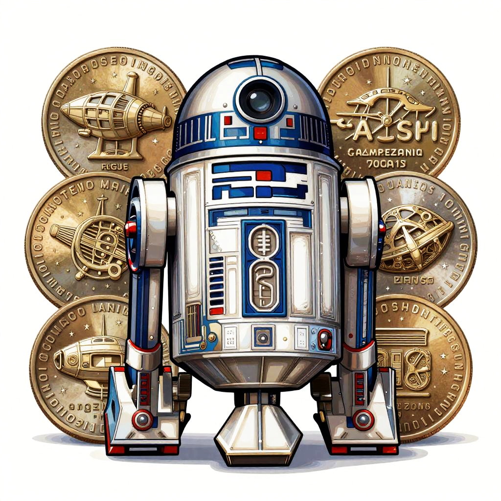 R2d2 quarters illustrated as vintage sci-fi currency with robotic and starship motifs, metallic coins stacked with subtle reflections, detailed engravings, futuristic and antique fusion style