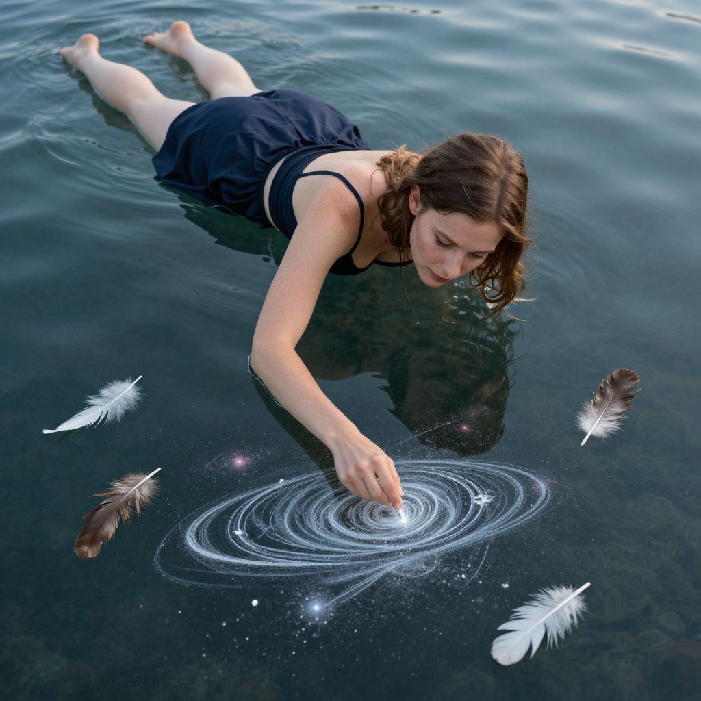 A photograph of a young woman with fair skin and brown hair, wearing a black sleeveless dress, floating in a dark, calm body of water. She is lying on her stomach, reaching out with her right hand to touch a glowing, circular, white, magical pattern in the water. Surrounding the pattern are several white and brown feathers. The water reflects light, creating a serene atmosphere. Her expression is focused and peaceful as she interacts with the mystical circle. The overall mood is ethereal and dreamlike.