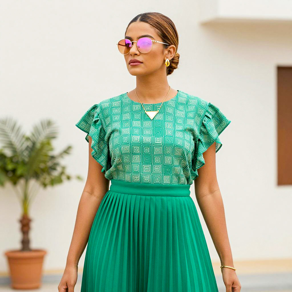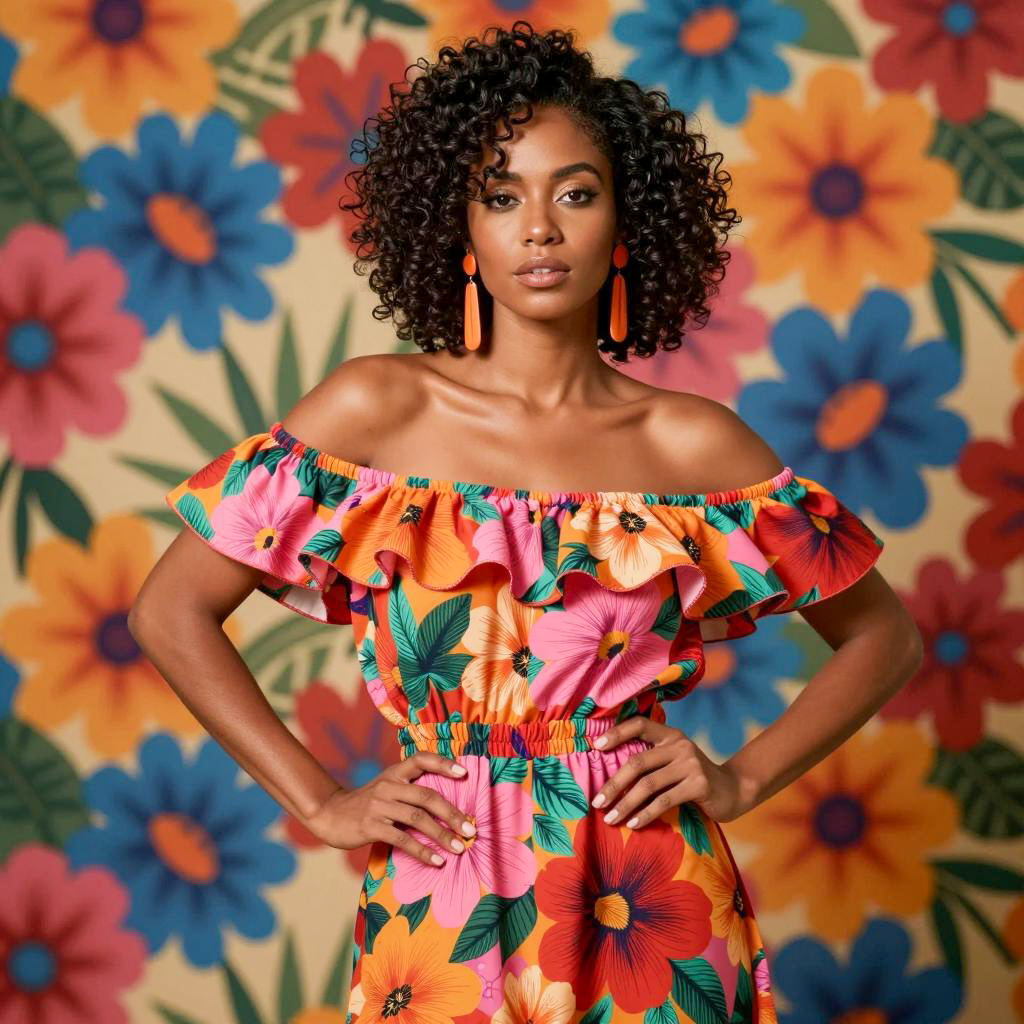 Photograph of a woman with medium brown skin, long wavy brown hair, wearing white square sunglasses, an orange off-the-shoulder crop top, orange high-waisted skirt, orange headscarf, and large orange earrings. She sits in a wicker chair, leaning back with hands on chair arms. Background includes blurred outdoor setting with wicker furniture and greenery. Sunlight illuminates the scene.