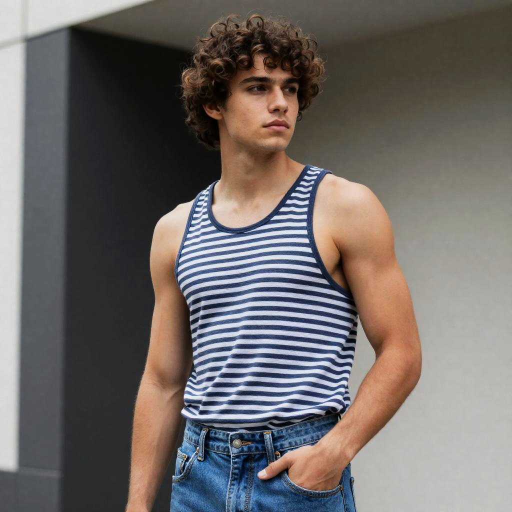 Photograph of a man with dark, tousled hair, leaning against a brick wall. He wears a black leather jacket, white t-shirt, light blue jeans, and white sneakers. Sunlight casts diagonal shadows across the brick wall. A white sink is on the left. The man's head is tilted downward, with a relaxed expression.