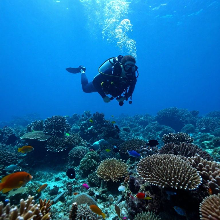 Photograph of an underwater scene featuring a scuba diver in black wetsuit and oxygen tank, swimming horizontally. The diver, with a black mask and regulator, is centered in the image. The background is a vibrant, clear blue ocean with sunlight filtering from above. The ocean floor is covered with diverse coral reefs, including branching and stony corals, and small colorful fish in orange, yellow, and purple. Bubbles rise from the diver's mouth. The overall texture is crisp with a mix of sharp coral and soft, diffused light in the water.