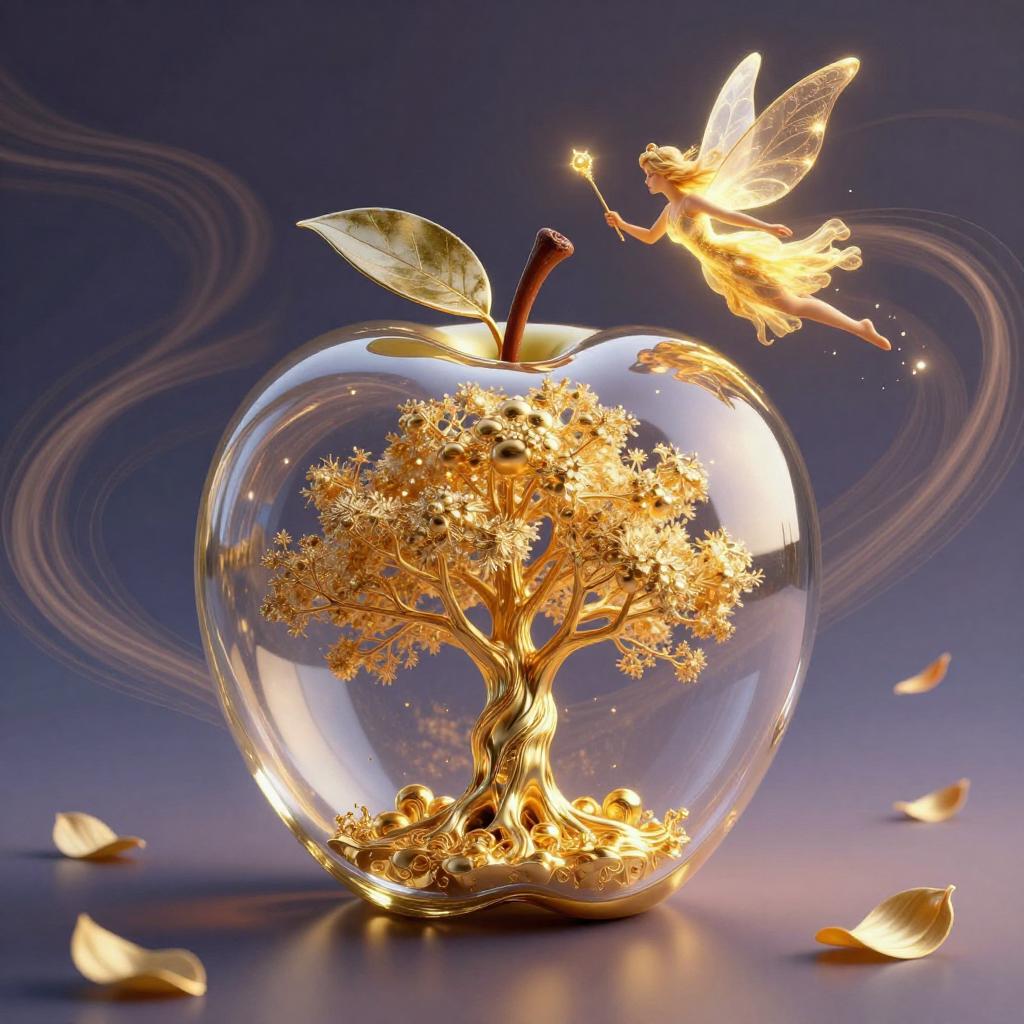 Photograph, photorealistic, ultra-realistic, intricately detailed, wide angle, fine fractal glossy vivid colored shiny contours outlines of a glass apple with a ("a glowing golden flying female fairy uses her wand to transform a tree to solid gold.") inside, surreal, gradient, windy, petals floating on the wind, swirling ribbons of ink and light. linquivera, liiv1