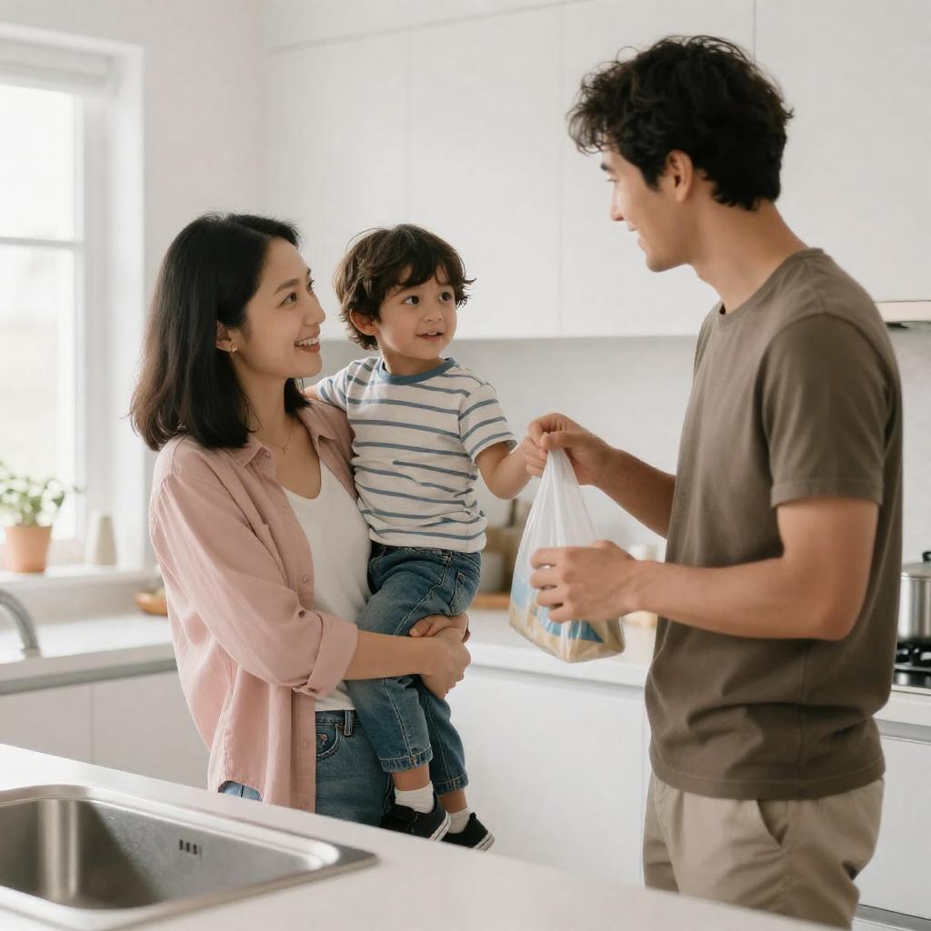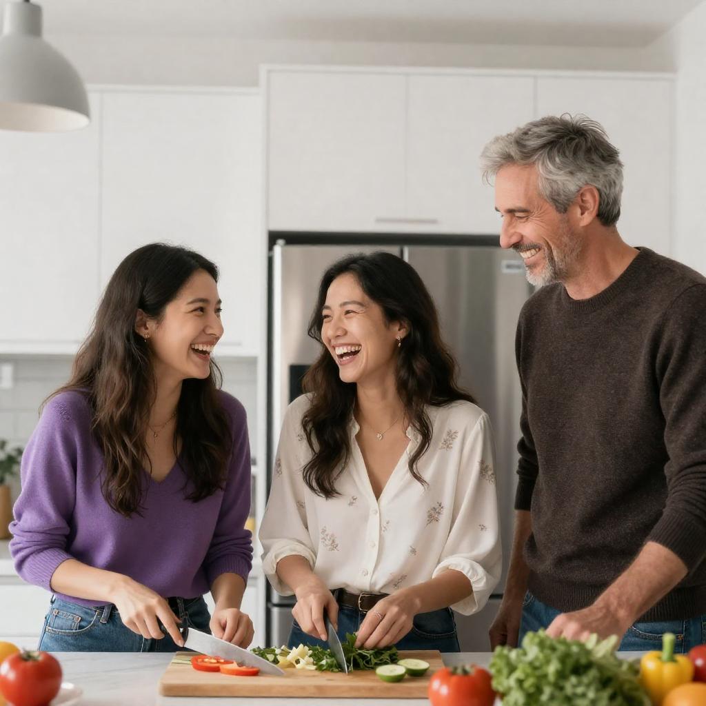 Photograph of a kitchen scene: a woman with shoulder-length black hair, wearing a beige cardigan over a gray top, slices vegetables on a countertop. A young girl with brown hair, in a yellow shirt, stands to the right, holding a paper. A man in a blue plaid shirt stands in the background. The countertop has a knife, vegetables, and a bottle. Warm, yellow kitchen lighting.