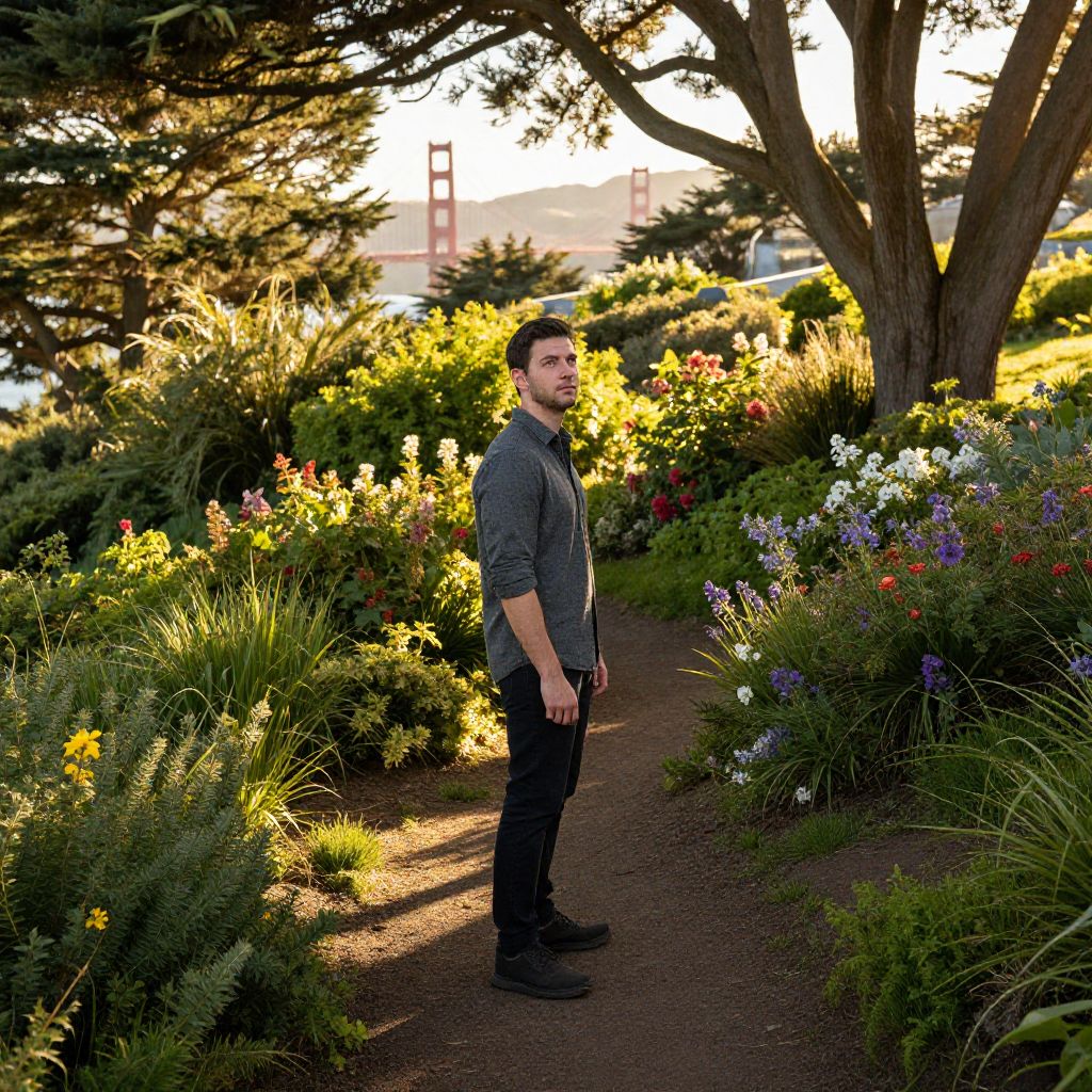 Golden hour sunlight filters through dense foliage, casting dappled shadows on the path ahead. A solitary figure stands tall amidst the verdant landscape of San Francisco's iconic Golden Gate Park, surrounded by blooming flora in every hue. The camera tilts upwards, emphasizing the subject's stature as he gazes out towards the distant horizon, his expression contempl Man has masculine face and piercing eyes