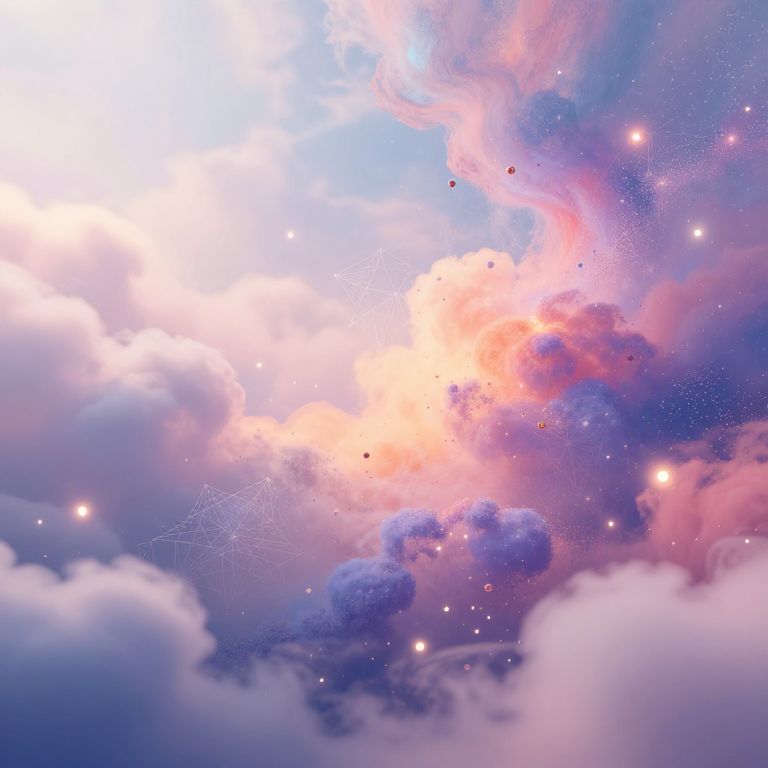 Stabile diffusion visualized as a surreal landscape of floating particles gently blending into misty clouds, soft glowing lights intertwined with delicate geometric patterns in a dreamy, ethereal atmosphere, high detail, vibrant color palette, digital art style.