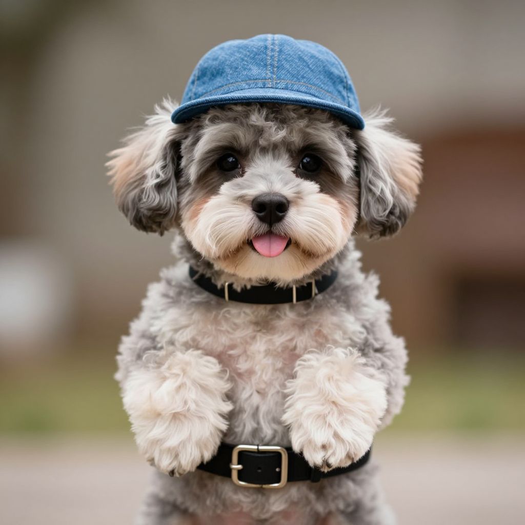 Costume puppies, dog, 1girl, hat, animal, holding animal, solo, belt, looking at viewer, holding, realistic, blurry background, blurry, puppy, lips
