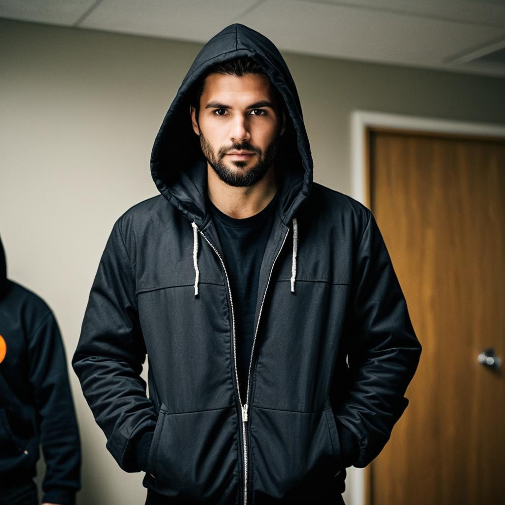Halloween costume work guy ,solo, 1boy, hood, realistic, male focus, facial hair, jacket, beard, looking at viewer, black pants, pants, black jacket, hoodie, shirt, brown hair