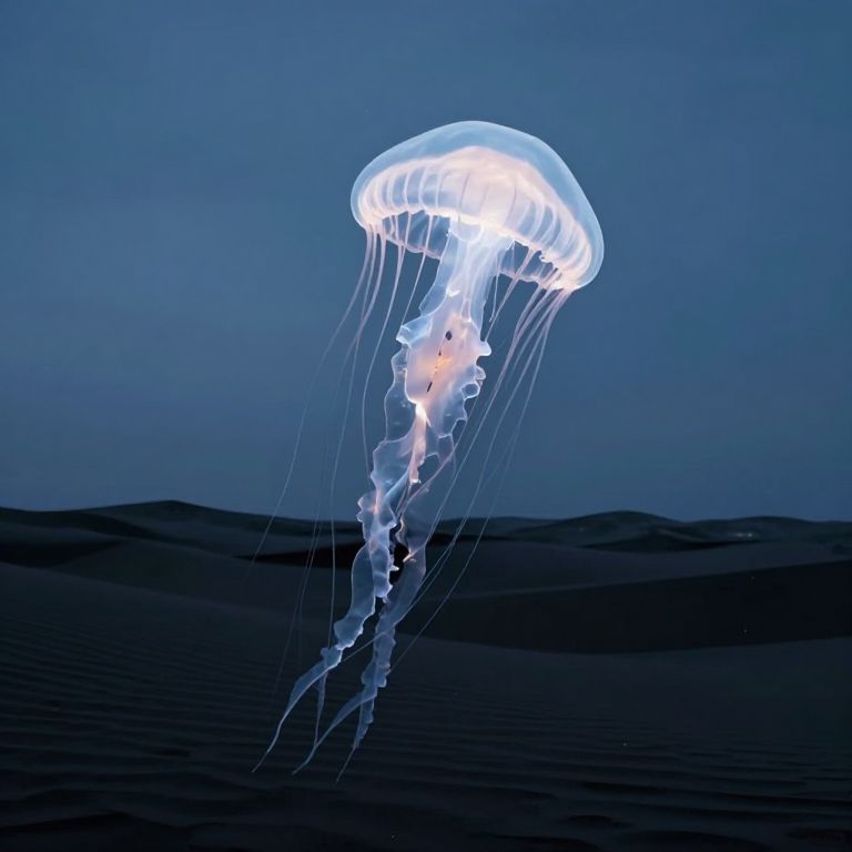 Towering translucent jellyfish, glowing with ethereal luminescence, drifts gracefully through a serene, stormless sky above undulating black sand dunes that stretch endlessly beneath.