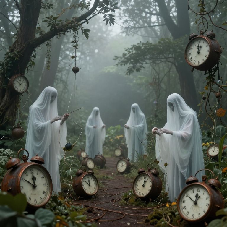 Mysterious clocks dangle from twisted vines above a misty forest path, their hands frozen in time as they cast eerie shadows on the damp ground below.