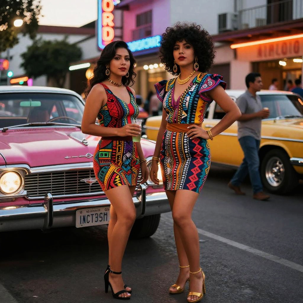 Mexican 80s style vibrant street scene, neon colors, vintage cars, people in retro fashion with big hair and bold patterns, Aztec motifs, city nightlife, cinematic lighting