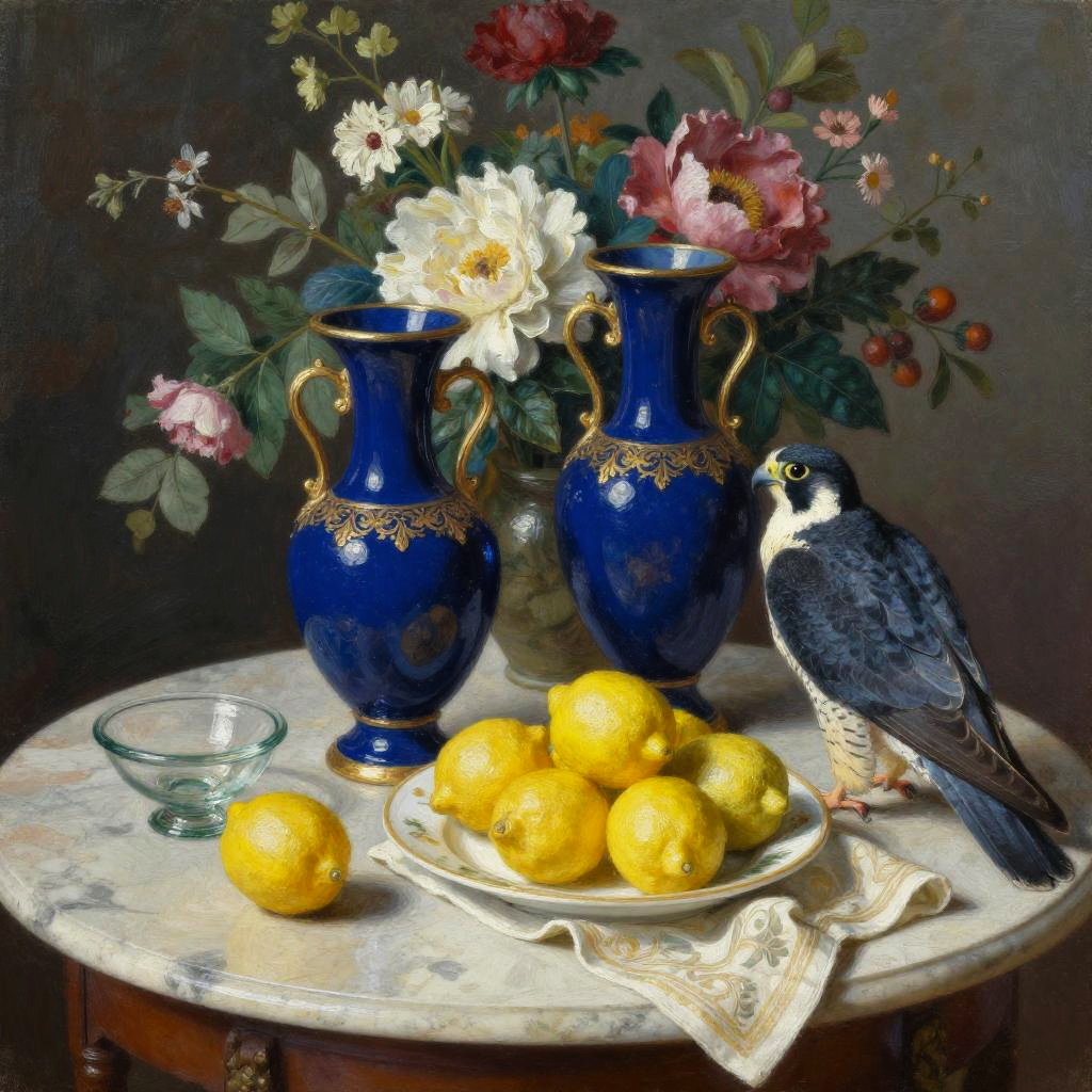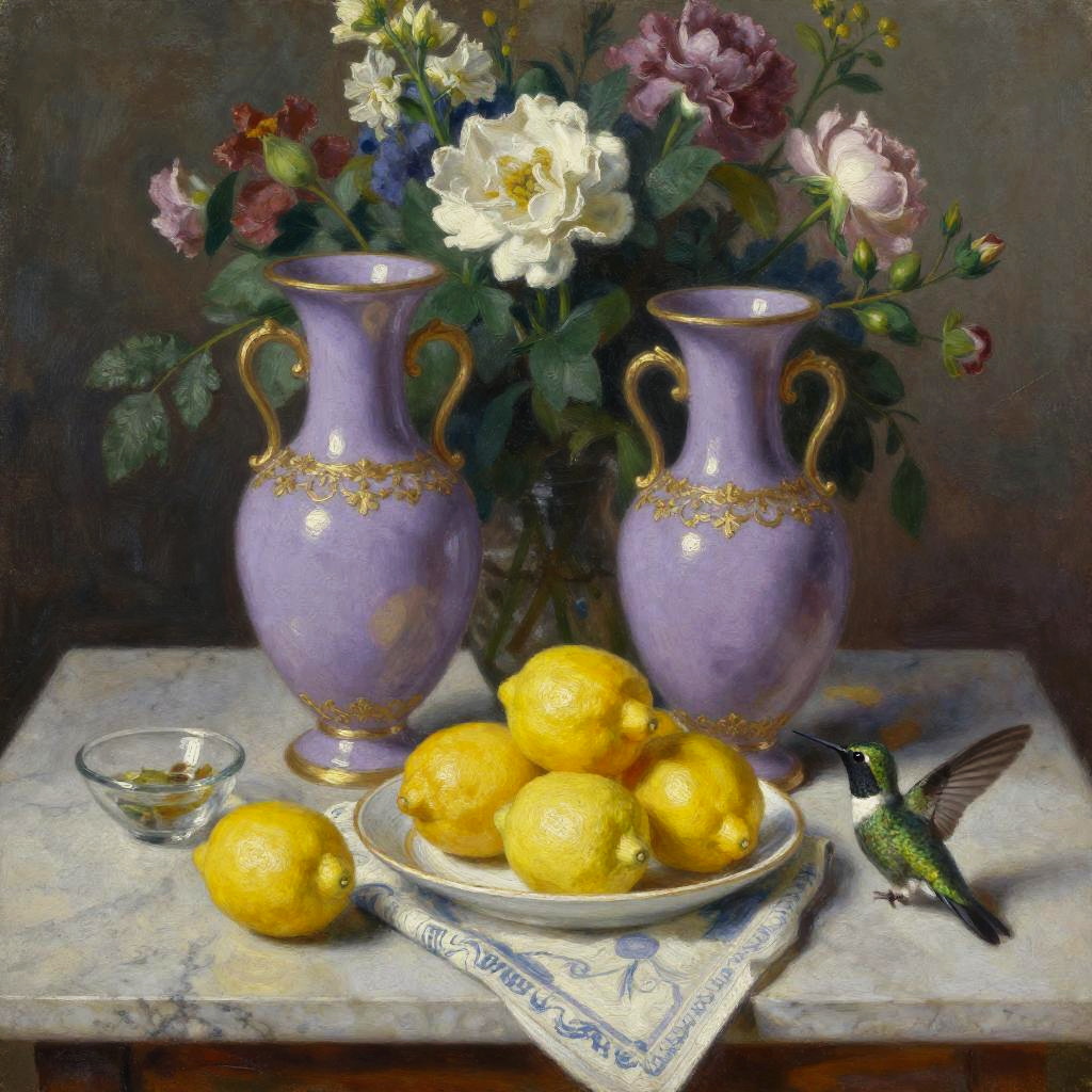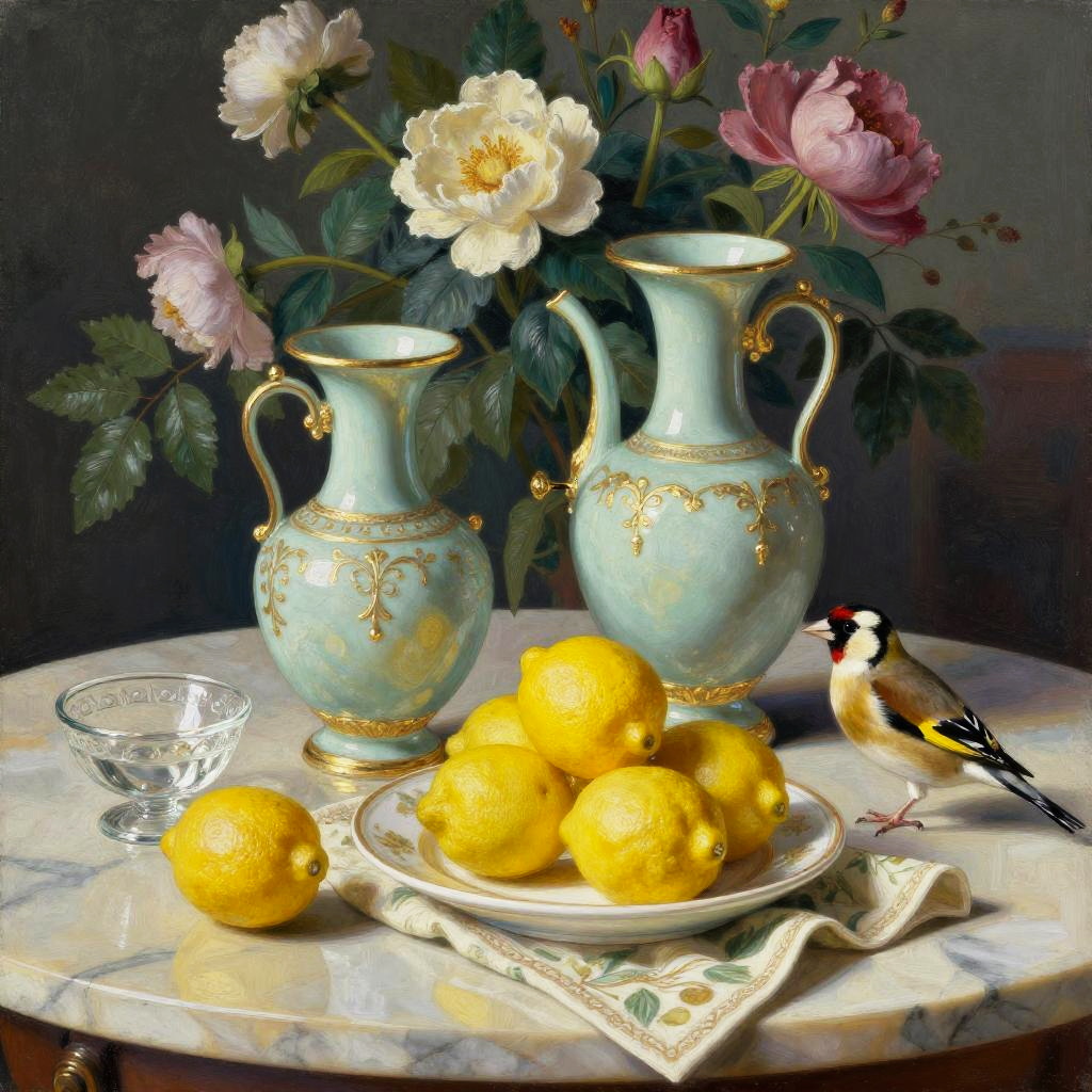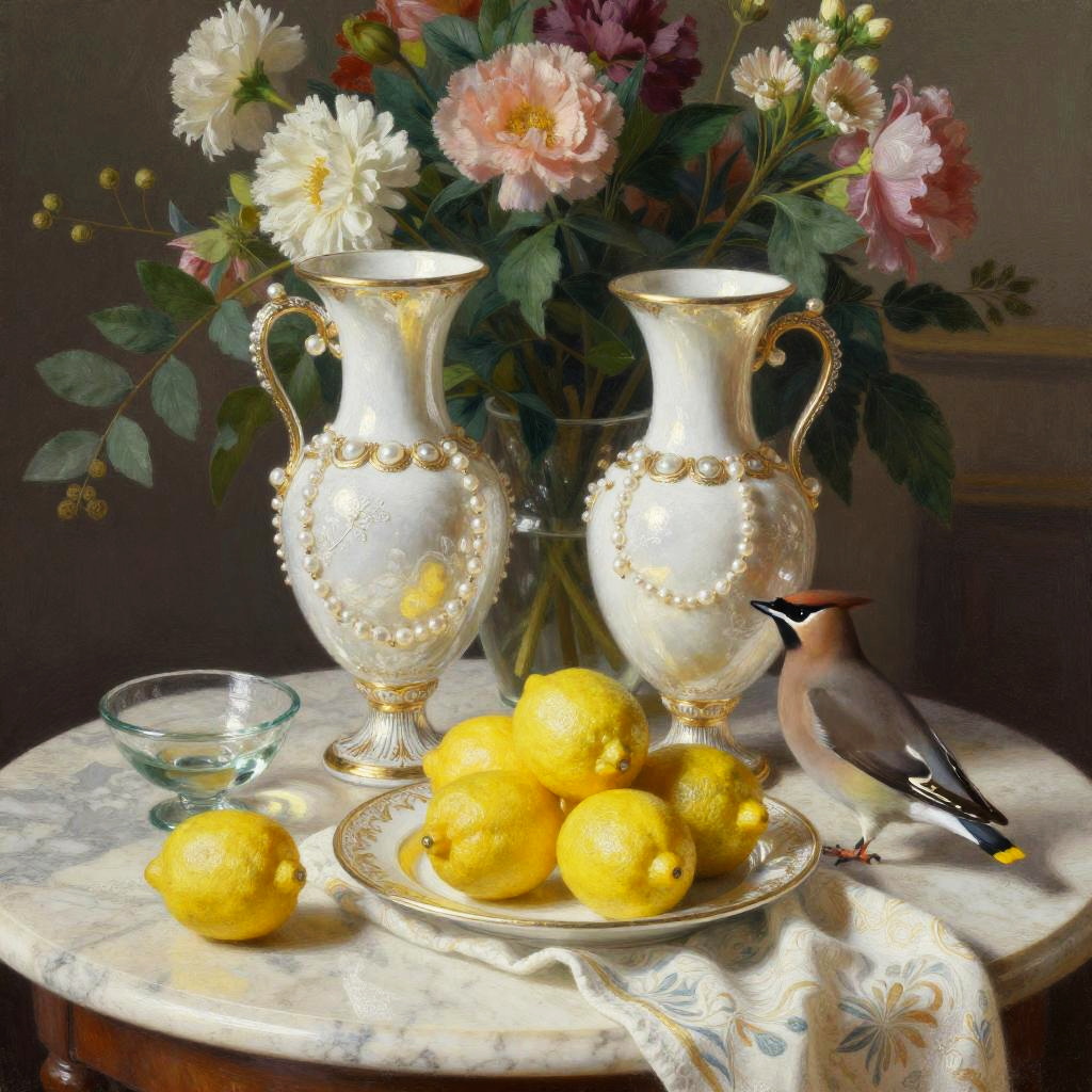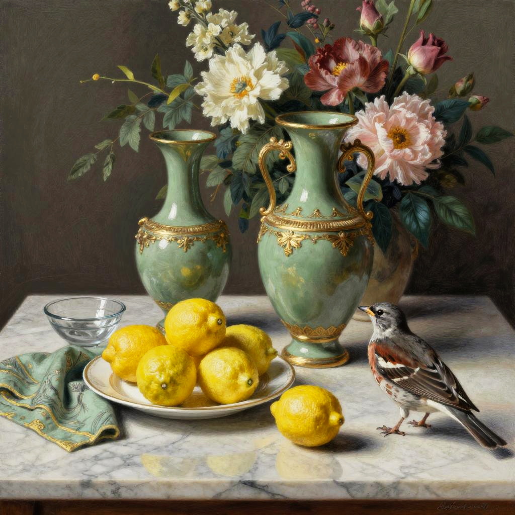 Silverpoint engraving still life on a marble tabletop: two ornate, soft peach vases with delicate gold accents stand before a lush floral backdrop. In front, a white plate overflows with bright lemons on coordinating cloth; a few scattered fruits and a small glass bowl add rhythm. A black-capped chickadee with white cheek patch rests near the edge, calm and attentive. Soft directional light, realistic textures, subtle reflections, balanced composition, gentle shadows, rich color harmony, museum ambiance, high detail, painterly finesse.