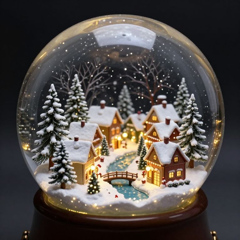 The image depicts a beautifully crafted snow globe featuring a charming Christmas village scene. Inside the transparent sphere, a quaint village is nestled amidst a winter wonderland, with snow-covered rooftops and trees blanketed in snow. The village is adorned with festive Christmas decorations, including lights that cast a warm glow, enhancing the cozy atmosphere. A stream winds through the village, flanked by trees and a bridge, adding a serene touch to the scene. The village is surrounded by a backdrop of dark, leafless trees, creating a stark contrast with the bright, illuminated village. The overall composition is enchanting, evoking a sense of fairytale-like magic, with the snow globe acting as a protective bubble over the idyllic village.