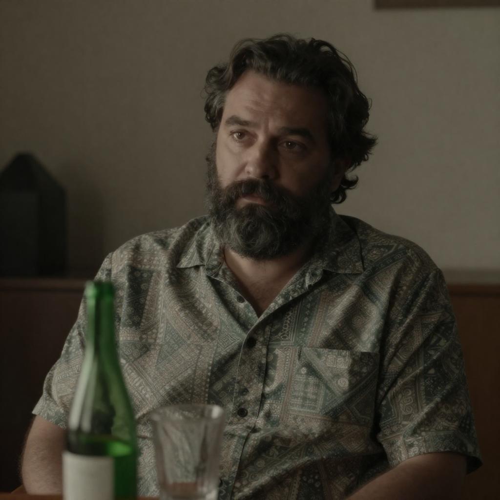 Middle-aged man with thick beard, dark wavy hair, wearing a patterned green and white shirt, sitting in dimly lit room. Green bottle and glass on table in front. Shadowy background with a silhouette and mountain-like structure.