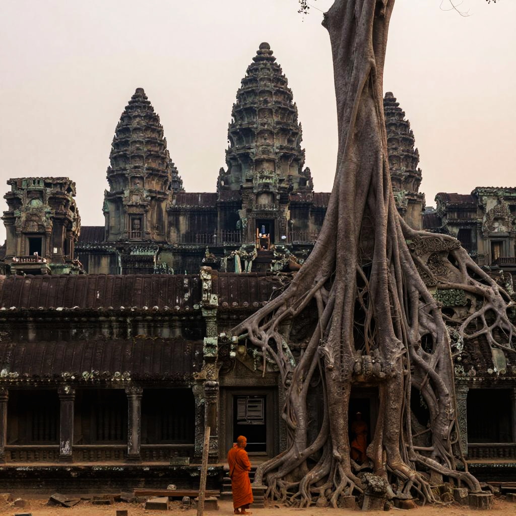 Photograph of a serene Buddha face, encircled by intricate, twisting tree roots, creating a mystical, natural sculpture. Monochromatic, high