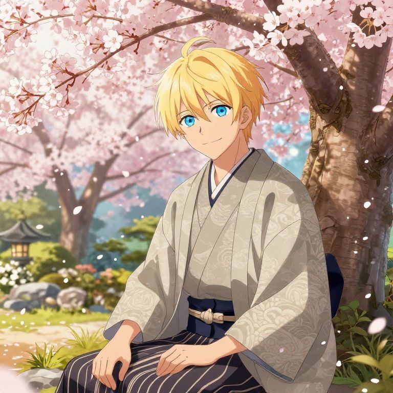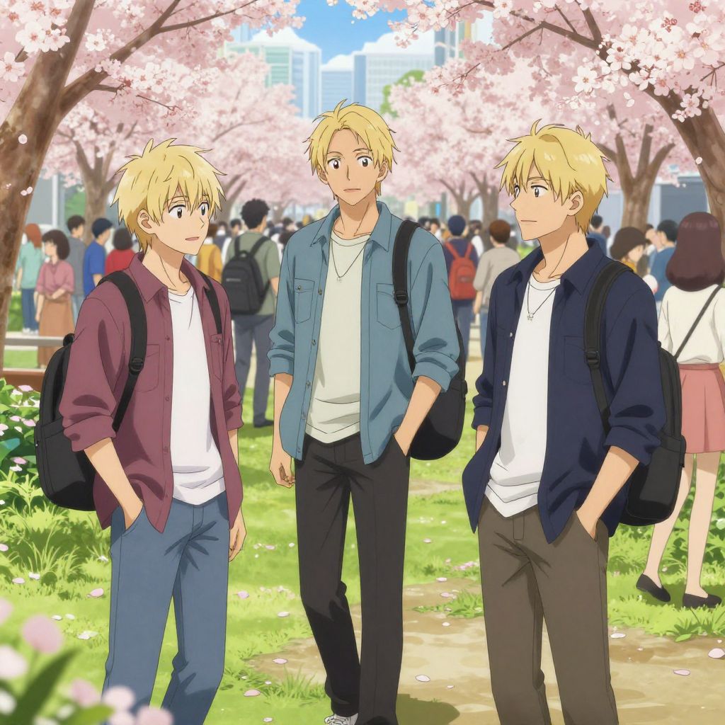 Blond anime men in casual streetwear, hanging out in a lively urban park during spring, surrounded by blooming flowers and bustling crowds, soft lighting, expressive faces, vibrant and colorful anime style with smooth linework.