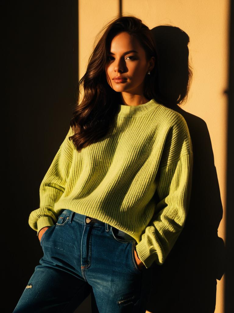 Portrait of a young woman wearing a black ribbed knit top with a deep plunging neckline and silver zipper detail. She pairs the top with high-waisted tapered plaid trousers featuring a gray and black pattern, accessorized with a black belt with a gold buckle. The warm lighting enhances her natural makeup and soft brown hair, set against a plain beige background with geometric shadows.