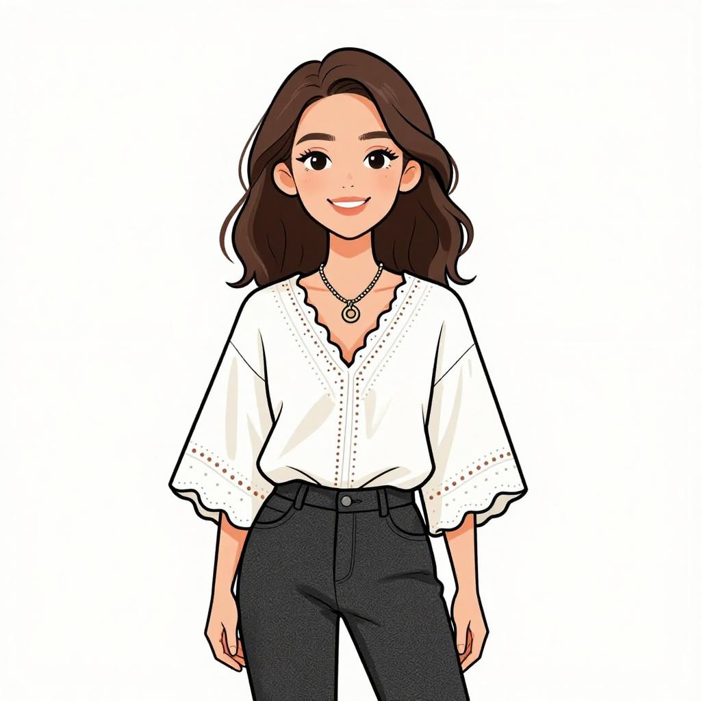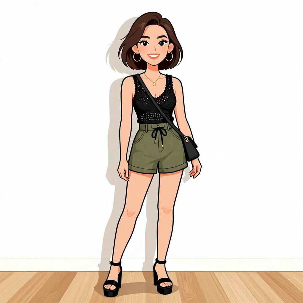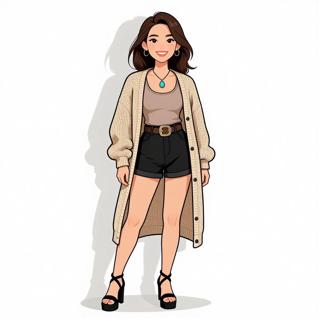 Woman with pretty face and pretty hair. smiling Woman, casual chic, oversized beige knit cardigan, high-low hem, long ribbed cuffs, layered over a taupe scoop-neck tank top, tucked into black high-waisted shorts, belt loops, statement belt in brown with an ornate buckle, strappy black platform sandals, turquoise pendant necklace, simple makeup, studio background with a white wall and light shadow --sref 1467