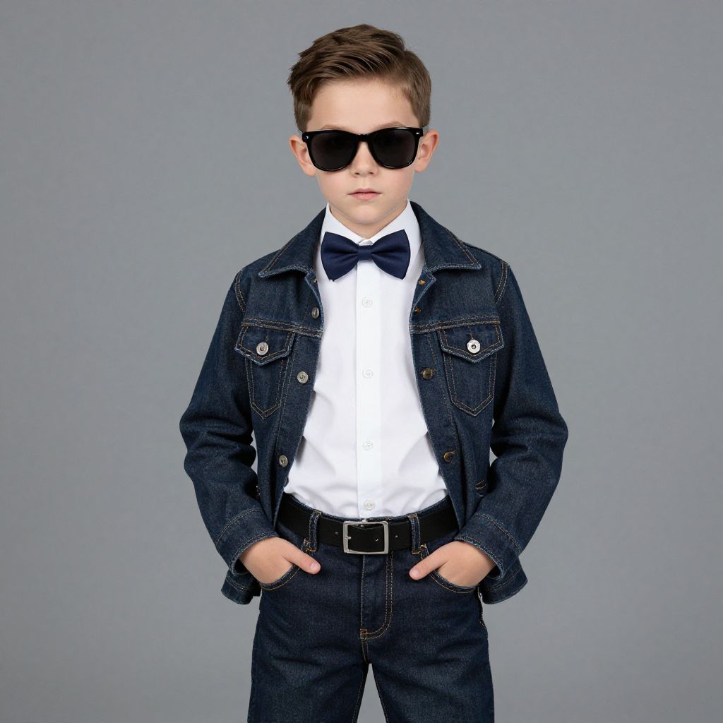 Photograph of a young boy with short, styled brown hair and fair skin, wearing black sunglasses, a dark blue denim jacket with buttoned chest pockets, a white dress shirt, a black bow tie, and black jeans with a belt. His hands are casually placed in his jean pockets. The background is a solid, light gray color. The boy exudes a cool, confident demeanor, standing straight with a neutral expression. The image has a modern, fashion-forward style.