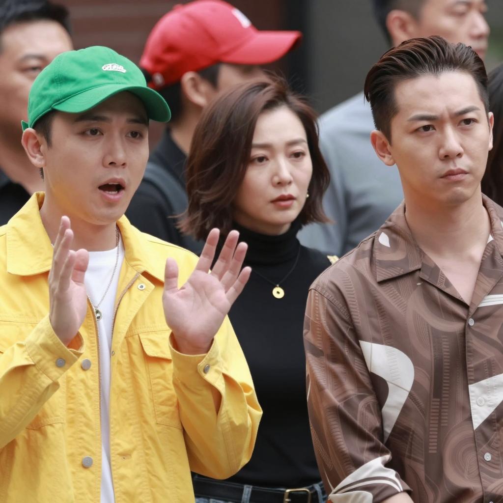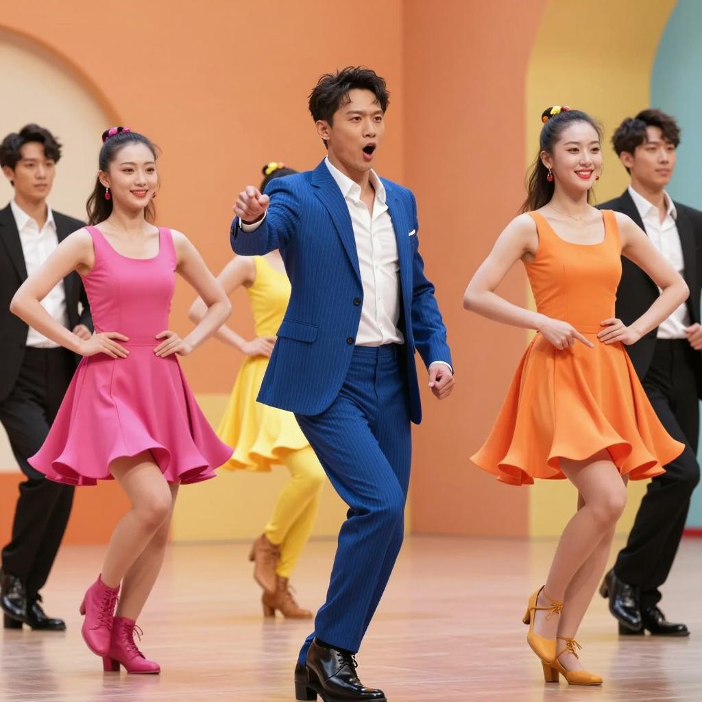 Group of six people dancing in colorful outfits. Central man in blue pinstripe suit and white shirt, mouth open, reaching out. Woman in orange dress and yellow pants to his right, smiling, pointing. Woman on left in pink dress and pink boots, hands on hips. Background has orange and yellow patterned wall, other dancers in various outfits. Bright, lively scene with dynamic poses.