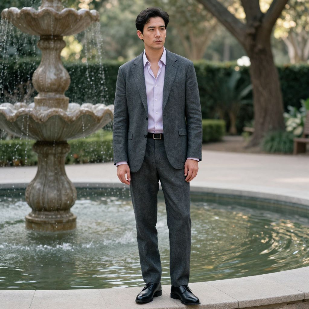 A man, charcoal gray linen suit, soft lavender open collar shirt, black leather dress shoes, sleek black belt, modern and refined look, serene garden, soft sunlight filtering through trees, tranquil water fountain, medium format film, contemplative expression. Man has masculine face and piercing eyes