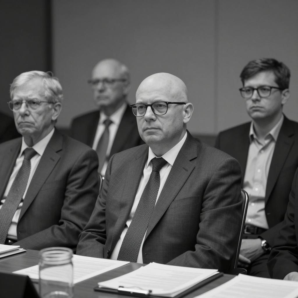 Black and white photograph of four men in a conference room. Central bald man with glasses, medium build, wears suit and tie, sits in middle. Two older men on left and right wear suits with ties, have serious expressions. One younger man with glasses on far right. Desk in front has glass jar, papers, and folders. Background is blurred with dim lighting.