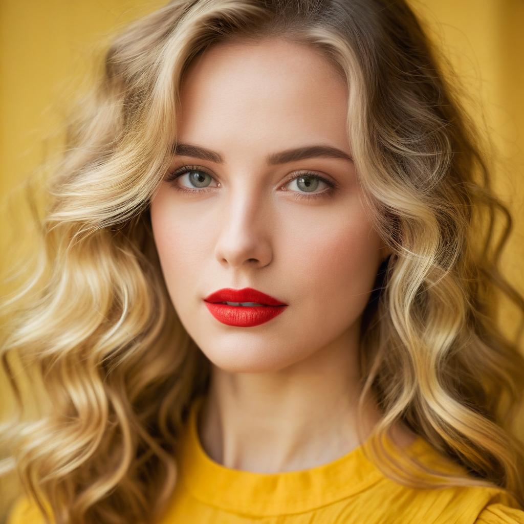 Close-up portrait of a young woman with long wavy blonde hair, natural lighting highlighting her facial features, wearing red lipstick and a yellow top, soft background blur, warm tone, sharp focus on the eyes, realistic skin texture