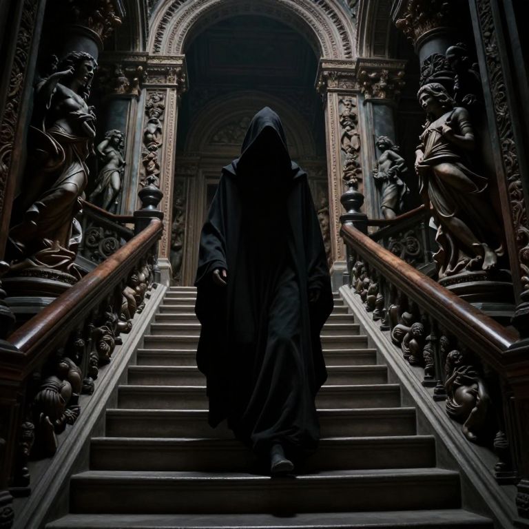 Photograph of a mysterious figure in a black hooded cloak ascending a grand, ornate staircase in a dimly lit, Gothic-style building. The figure is centered, shrouded in shadows, with only the hood and edges of the cloak visible. The staircase features intricately carved wooden banisters and statues of robed figures on either side. The background shows an arched, decorative doorway with detailed stone work. The lighting is low, creating a dramatic, eerie atmosphere. The image has a dark, moody, and suspenseful tone.