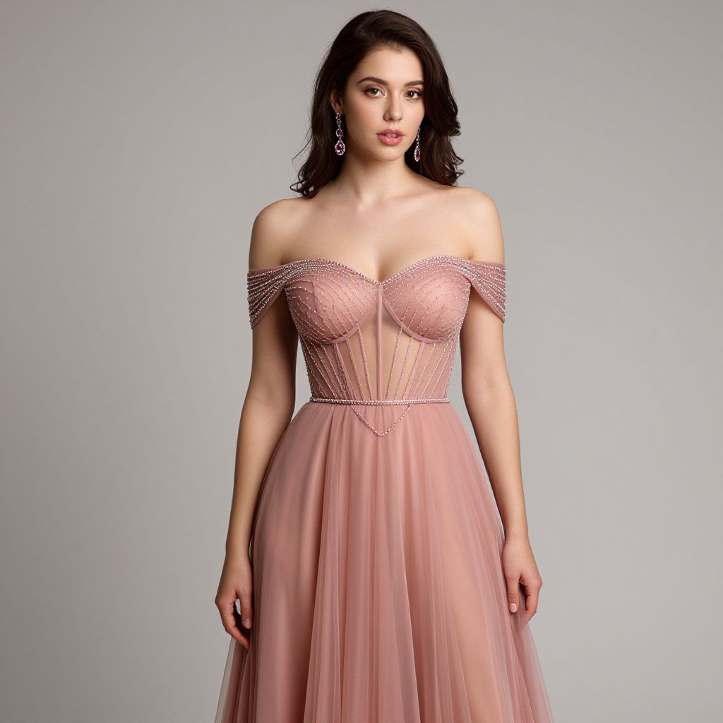 "Woman, romantic glamour, off-the-shoulder A-line dress in dusty rose, sheer overlay with intricate beaded detailing, sweetheart neckline with a transparent mesh insert, short sleeves with bead-encrusted edges, fitted bodice with visible boning, flowing floor-length skirt, drop earrings with gemstones, subtle makeup with a focus on soft pink lips, studio background. Sexy. Pretty face and beаutiful eyes. Big breasts."