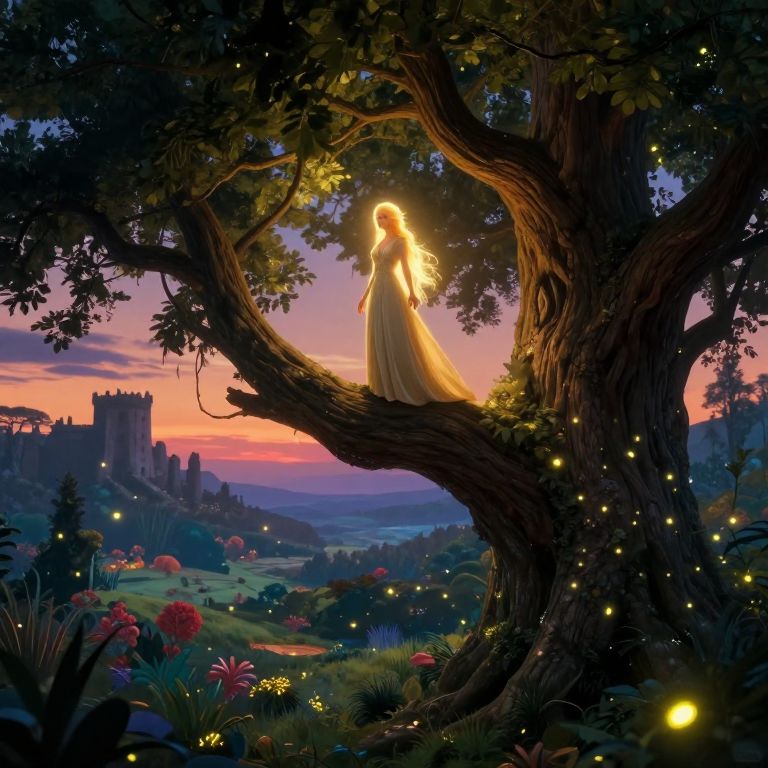 Visualize an awe-inspiring digital artwork reminiscent of Alan Lee's captivating style, depicting the magical realm inspired by J.R.R. Tolkien's legendary tales. In this serene setting, a graceful elf maiden with luminous golden locks stands gracefully upon the towering branches of a colossal tree, her eyes reflecting the shimmering sunlight filtering through the dense foliage above. The background reveals an enchanting valley teeming with vibrant vegetation and wildlife, evoking a profound sense of awe and serenity. As twilight descends, fireflies emerge, casting their gentle glow across the tranquil landscape in a mesmerizing display of warm, inviting colors. In the distance, the silhouette of an ancient fortress looms on the horizon, a testament to the rich history and captivating allure of this magical world.