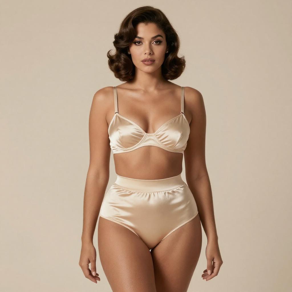 Image in the style of vintage art deco, confident brunette businesswoman, shoulder-length wavy hair, pear-shaped figure, lingerie cut-out set, satin bralette, high-waisted silk panties, ivory studio background studio background
