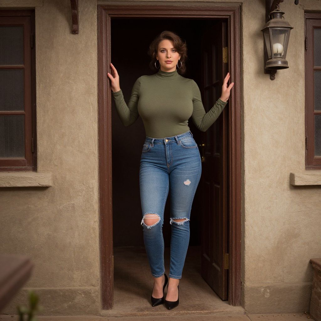 Photograph of a woman standing in a doorway. She has medium-length dark curly hair, fair skin, and is wearing a fitted olive-green turtleneck sweater and high-waisted, ripped blue jeans with distressing on the knees. She is also wearing black high-heeled shoes. Her hands are raised, resting on the door frame. The door is wooden and set in a beige stucco wall with a dark wooden window frame on the left and a black lantern on the right. The lighting is natural, highlighting her figure and the textures of her clothing and the wall. The image has a slight vintage filter.