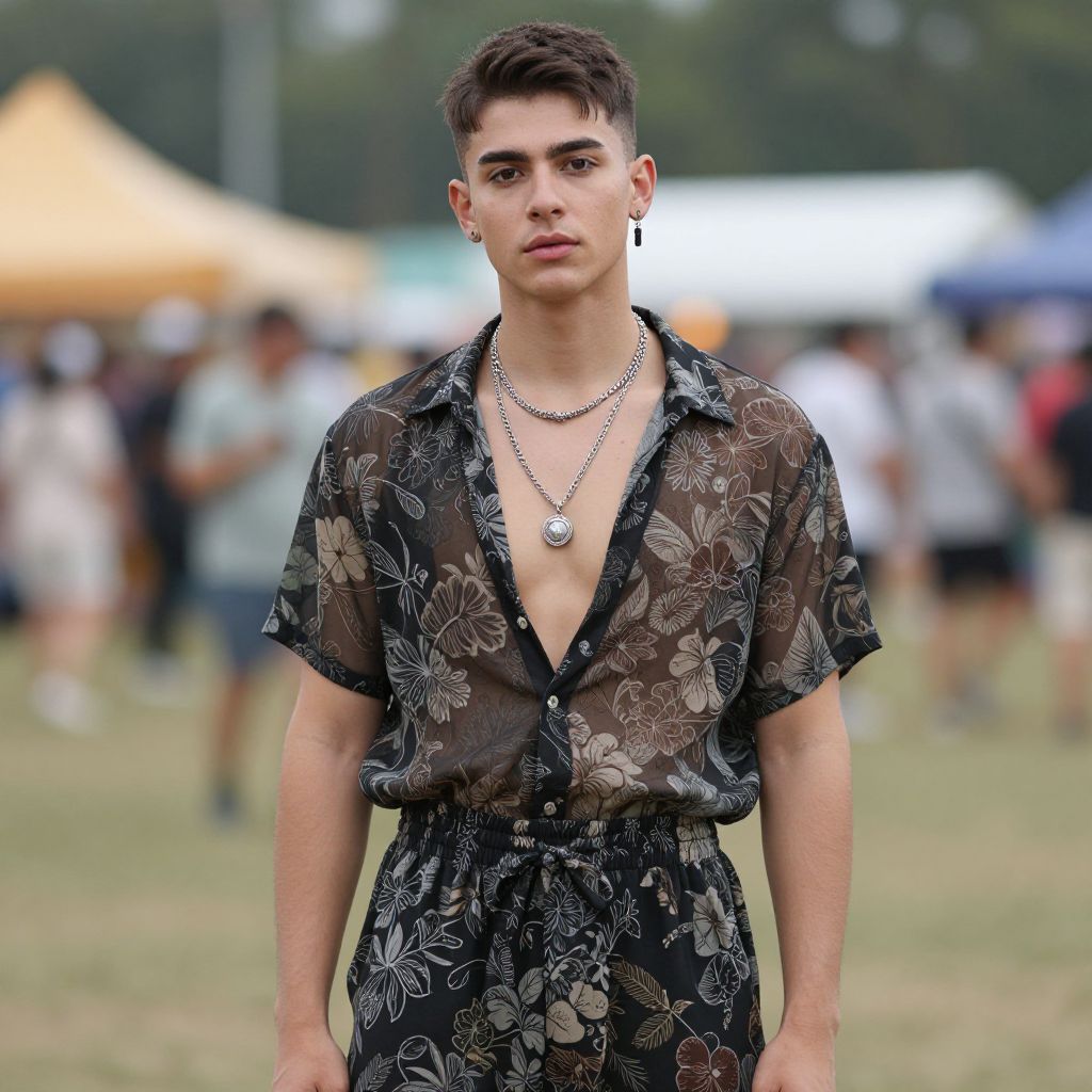 Photograph of a young, slender Caucasian man with short, dark brown hair and light skin, standing outdoors. He wears a sheer black floral shirt with a deep V-neck, revealing a silver pendant necklace and part of his chest. His pants match the floral pattern of his shirt. The background is blurry, with people in casual summer clothes and tents, suggesting a festival or outdoor event. The grassy field and trees are visible in the distance. He has a serious expression and stands confidently, looking directly at the camera.