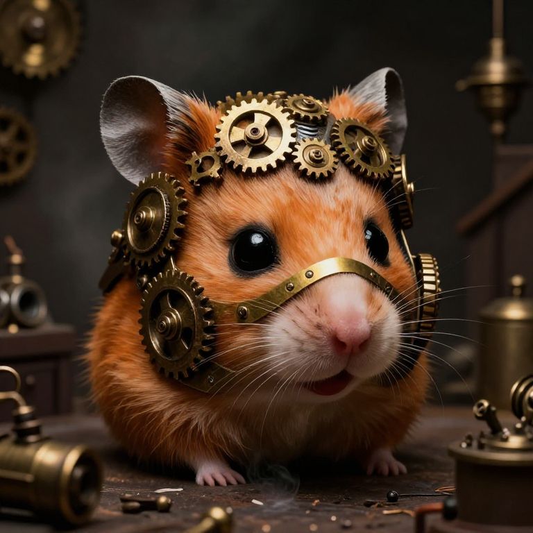 Hamster mask with steampunk elements, gears and brass details, worn by an adventurer in a smoky workshop filled with inventions, dramatic shadows, highly detailed mechanical textures