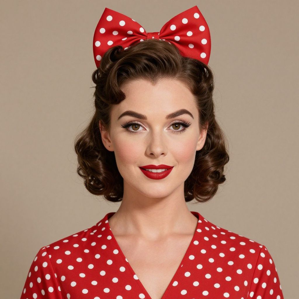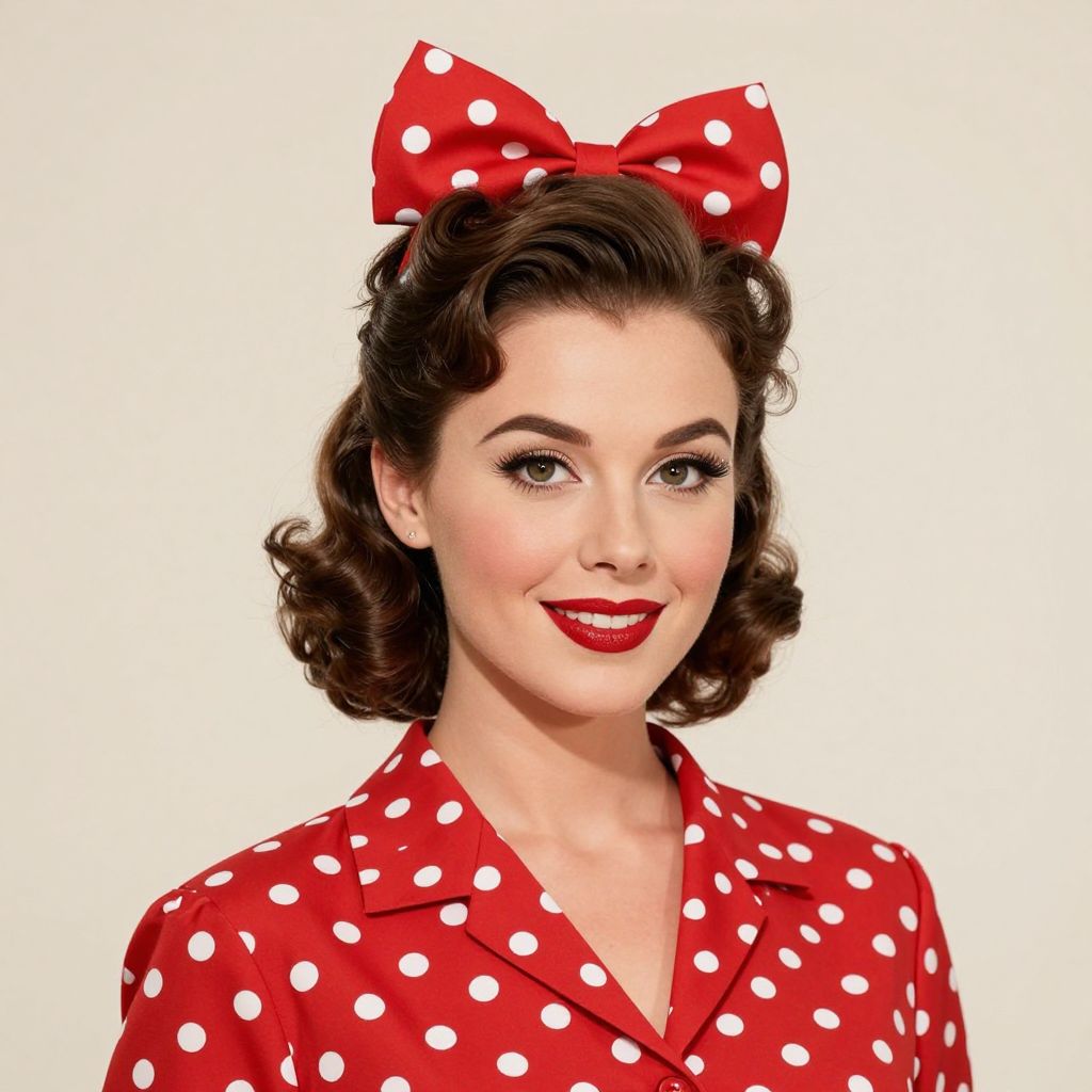 A vintage-inspired illustration featuring a woman with classic 1950s hairstyles and attire, including a red polka-dot dress and matching hair bow, rendered in high-definition detail with a retro aesthetic.