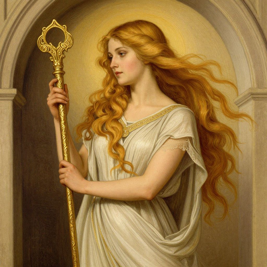 A woman with flowing golden hair stands gracefully in a warmly lit archway, her hands gently holding a delicate, ornate staff adorned with intricate designs, evoking a serene and timeless atmosphere reminiscent of Dante Gabriel Rossetti's \"The Gate of Memory\" (1864), rendered in a richly detailed, vintage-style illustration.