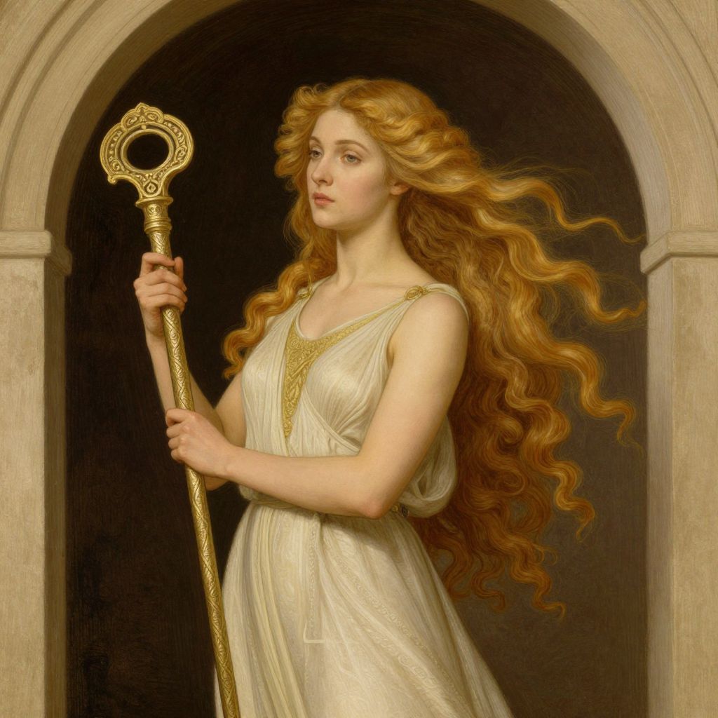 A digital painting of a fair-skinned, red-haired woman with wavy, flowing hair, wearing a white, classical Greek-style dress with gold trim. She holds an ornate, golden staff in her right hand, looking to the left with a serene expression. The background features a stone archway and a glowing, golden halo behind her head. The texture of the dress is smooth, and the staff is intricately detailed. The overall style is reminiscent of classical Renaissance art with a touch of fantasy. The lighting highlights her hair and halo, creating a divine, ethereal atmosphere.