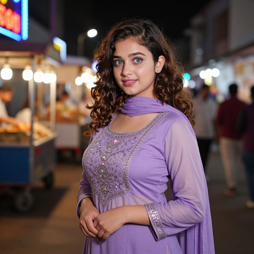A youthful woman with bright blue eyes, curly hair, and a playful expression dressed in a lavender colour salwar suit as a costume for a night market in Hyderabad, standing near neon lights and traditional food carts with a background of warm, dim lighting and soft ambient music.. The woman has big breasts and cute face